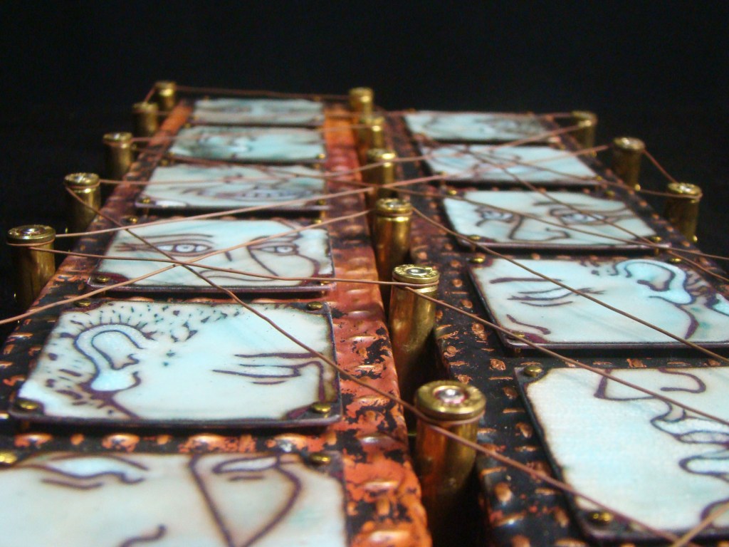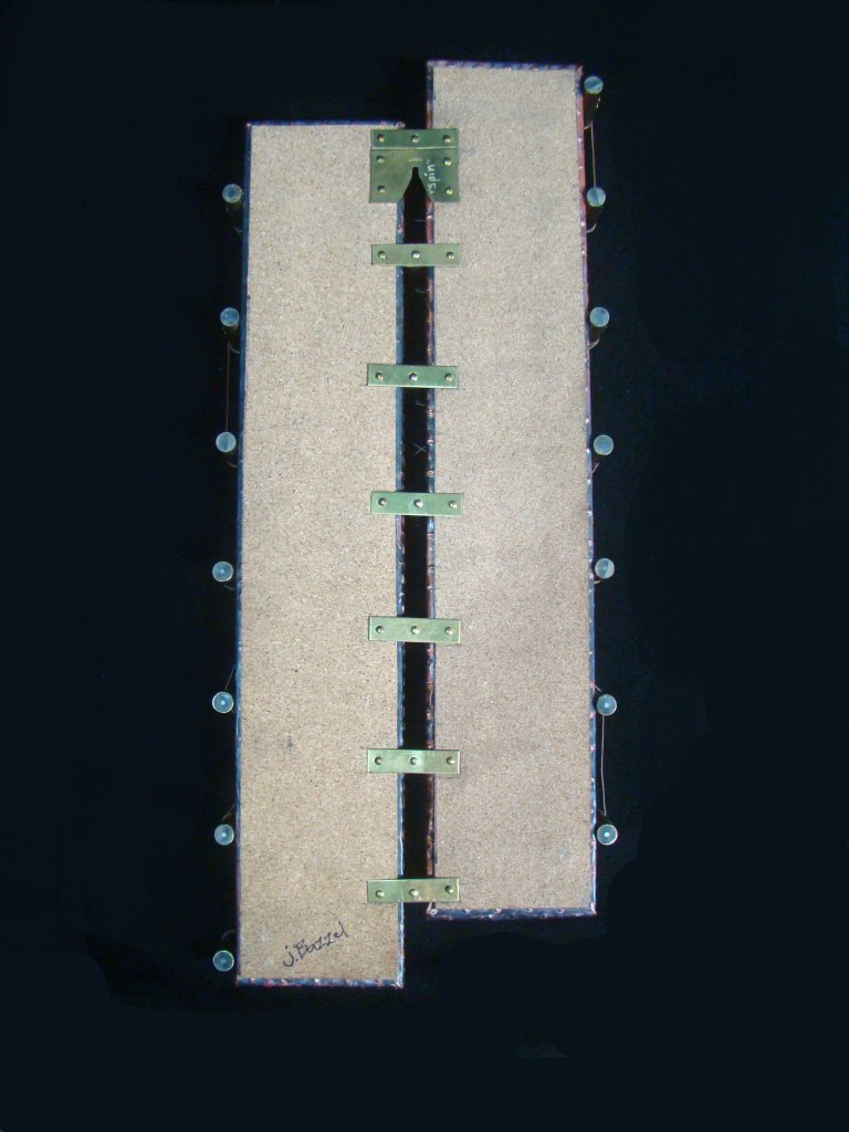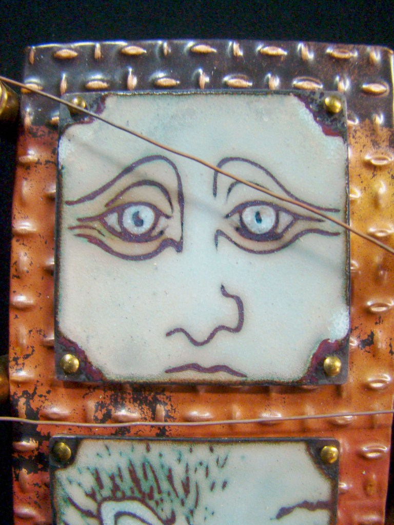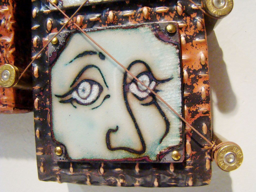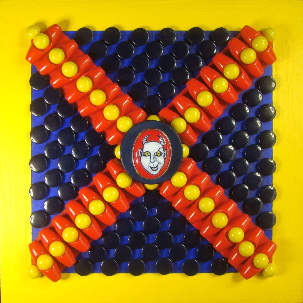 Finally! A proper frame for my Little Devil….the button placement is 6″x6″….the wooden frame is 8″x8″x1 5/8″H, and 3″H with the buttons and brooch. All the buttons are true color plastics, and all are attached by wire….no glue! The brooch is an original sgraffito enamel, 22mmx30mm, and it’s set in a sterling pin pendant combination….easily removeable from the hook made for that purpose.