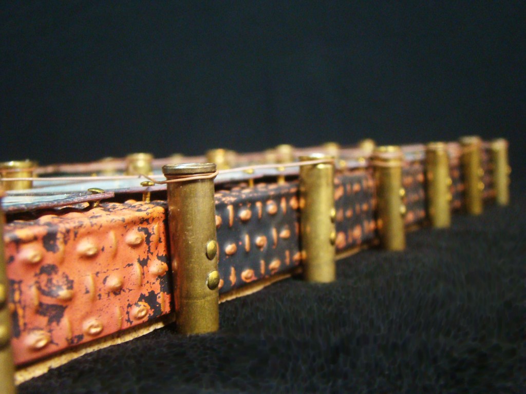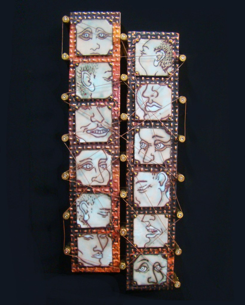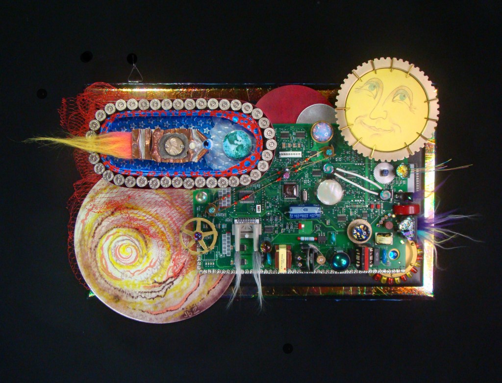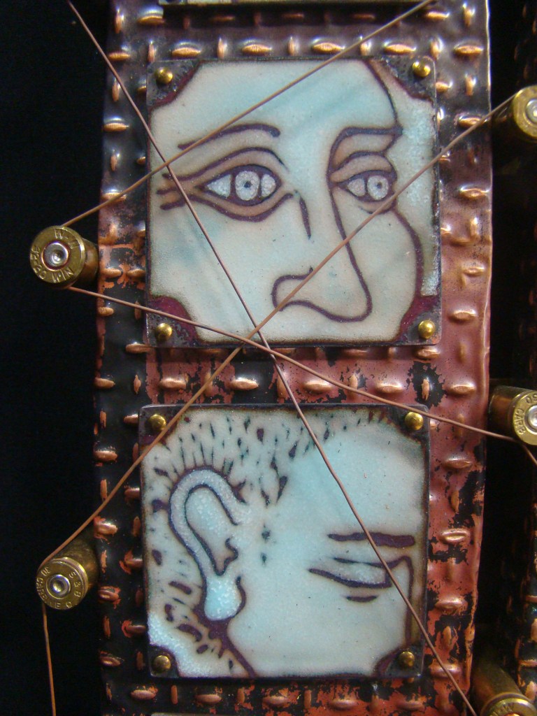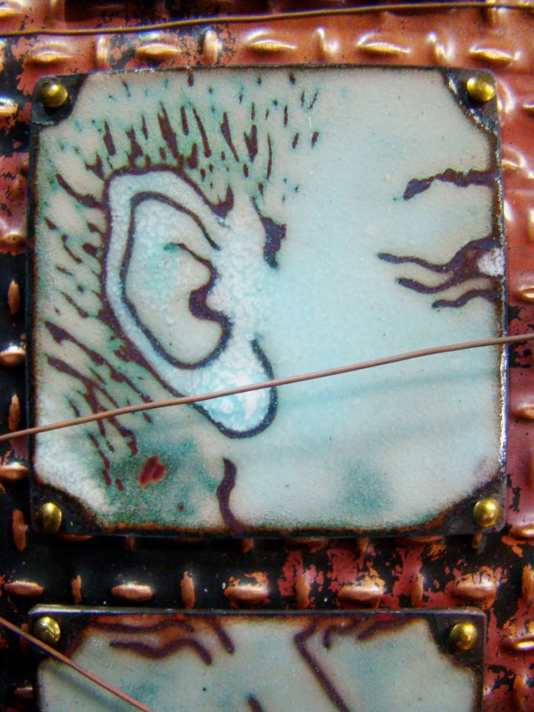Finally! A proper frame for my Little Devil….the button placement is 6″x6″….the wooden frame is 8″x8″x1 5/8″H, and 3″H with the buttons and brooch. All the buttons are true color plastics, and all are attached by wire….no glue! The brooch is an original sgraffito enamel, 22mmx30mm, and it’s set in a sterling pin pendant combination….easily removeable from the hook made for that purpose.